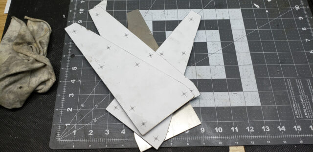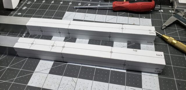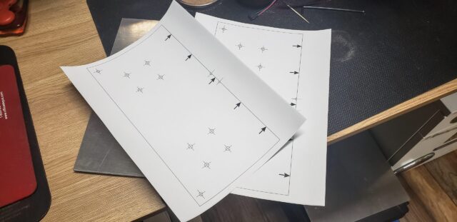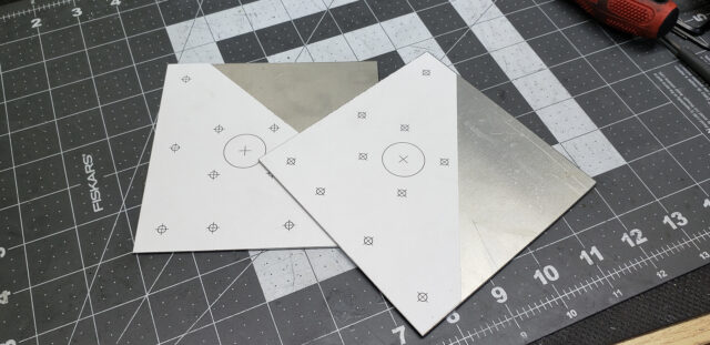 This turned out to be faster and more accurate than crawling all over the surface with a ruler, square, and calipers, transferring all those millimeters, inches, parrots, parsecs, and other astronomical units. Print, slap it on, punch, drill — and done. I stuck to this method for all other similar parts moving forward.