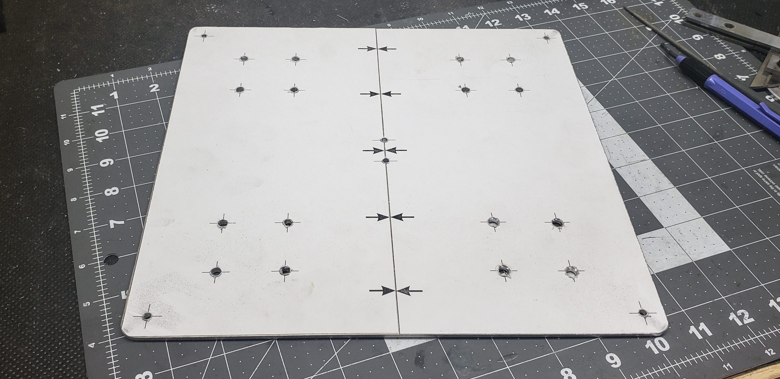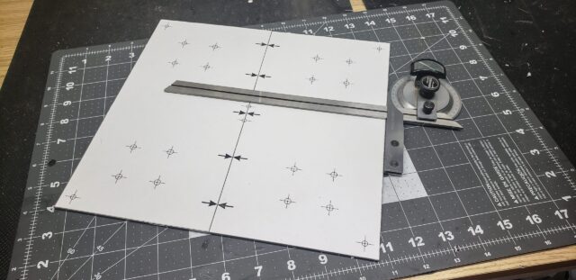 The problems begin when I have to mark something manually with calipers. For instance, a bunch of holes on this panel. The mounting holes for the heated bed are spaced in millimeters, while the ones for the bearings are in inches. Pretty quickly, I got tired of switching the calipers back and forth a million times or dealing with absurd fractions of millimeters or inches.