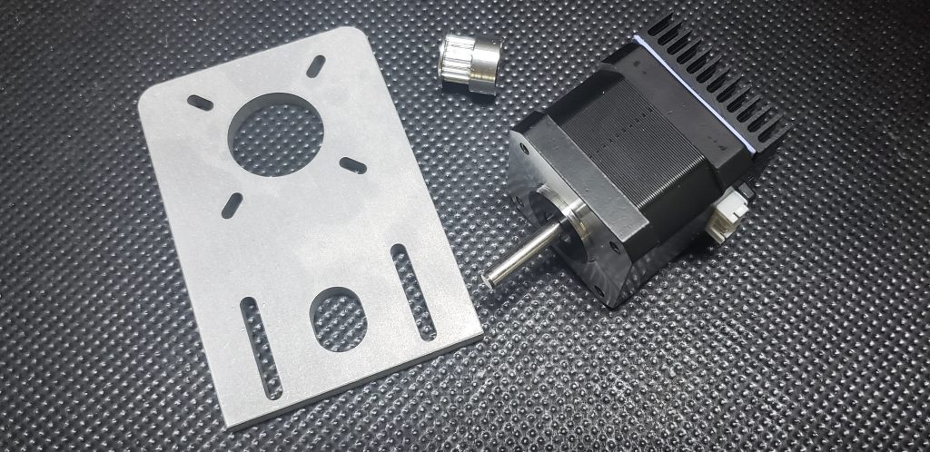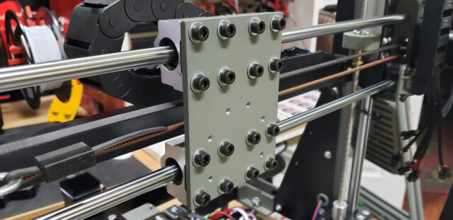 The key here is that a simple plate, even a thick one, might not be sufficient. The machine, to put it mildly, is quite heavy in every element. These motors, through their worm gears, will have to bear the weight of the entire X-axis bar — complete with all its bearings, guide rails, extruder nozzles, motor, fans, and other components.