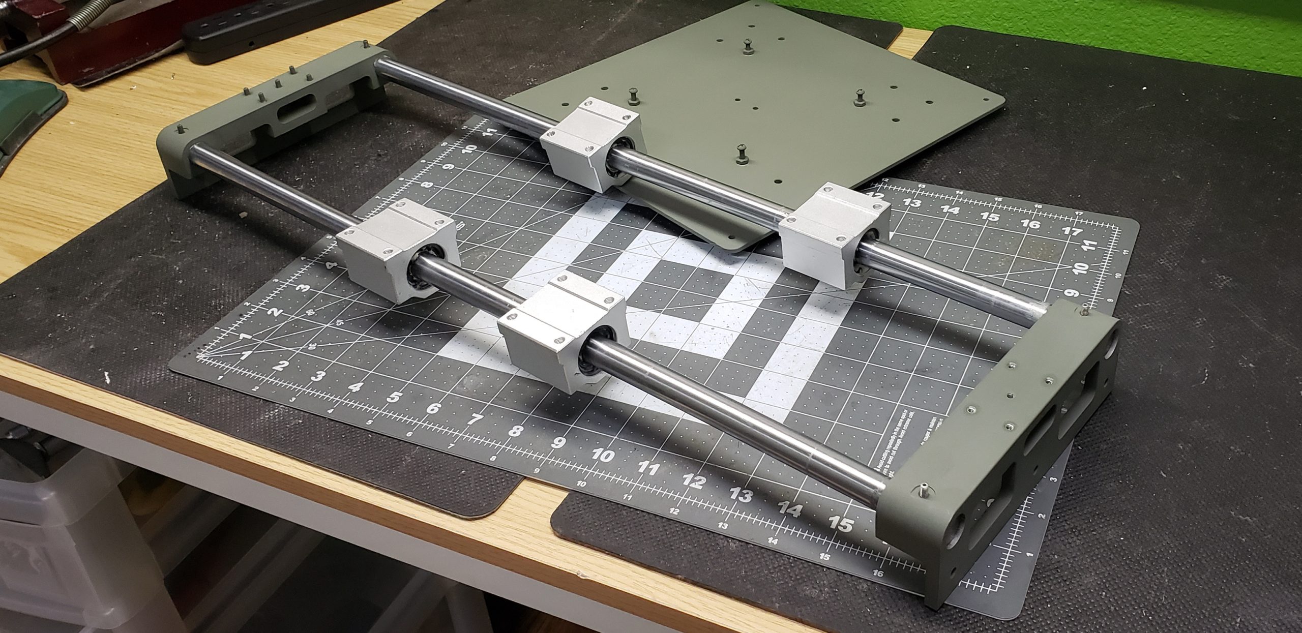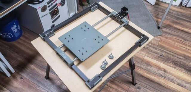 In reality, this still didn’t guarantee the desired result. The critical angle isn’t literally between the horizontal and vertical parts of the frame, but between the planes in which the Y-axis table and X-axis carriage move. It’s clear that the movement within these planes involves a ton of individual components. The cumulative errors that might arise during assembly are anyone’s guess. The best that could be done before everything was fully put together was to ensure maximum accuracy and care for every component and hope for the best.