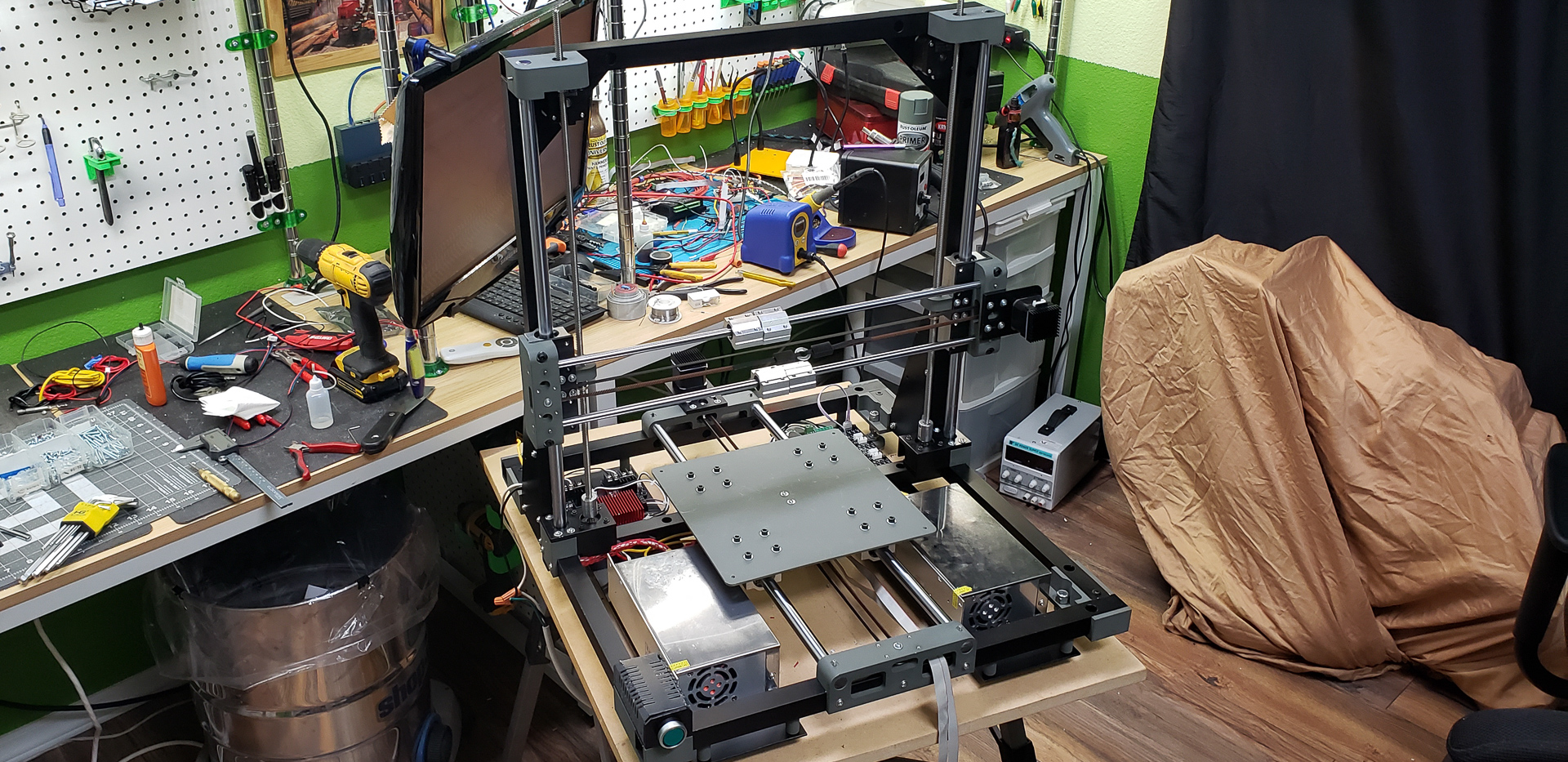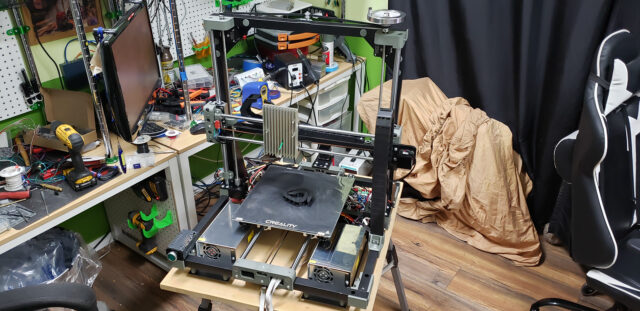 Guess what’s standing against the wall in the photo, covered with a sheet? That’s right! The mechanical dog, for which this entire printer was built. It’s covered because of the Cat… That little beast already got into the wiring in the dog’s head and chewed something up. I still don’t know what or how bad it is. I just found a few wires on the floor and identified them by their markings as coming from the dog’s head. What else that brainless creature has destroyed, I haven’t figured out yet… I really need to finish the printer faster to start printing the dog’s body panels, which will shield its delicate wiring. And I think I’ll need to embed an electric shocker in its nose to make sure someone learns to stay away!