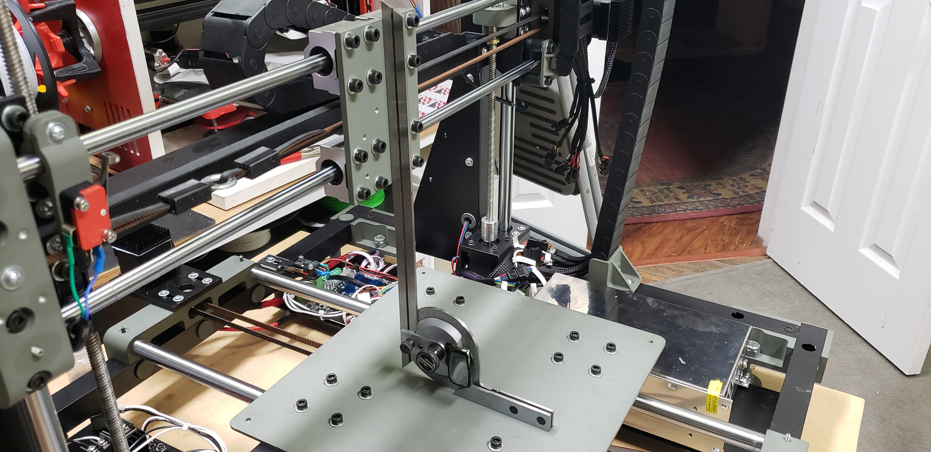 After assembling and running a test of all the axes, the moment of truth arrived. Only now could I determine how accurate I had been in fabricating and assembling all the components of the motion system. The most critical and telling measure of this is the Y-Z angle between the print head carriage plate and the mounting plate for the bed (not the bed itself — it’s adjustable, so testing against it is pointless):