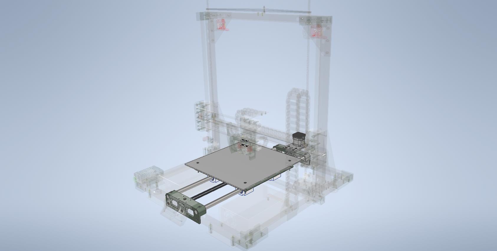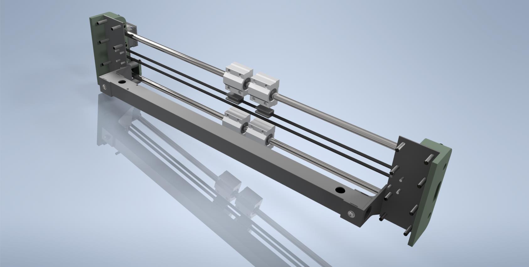 This part includes 16mm guide rails with CS16UU bearings, frame mounts, a heated bed, and a motor with a pulley that moves the bed along the rails.