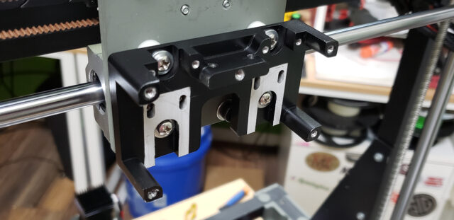For the filament drive, I opted for more advanced dual-gear extruder blocks with a shared gear coupling between the two shafts: