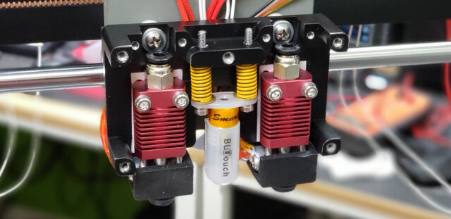 At the center, there’s something resembling a small syringe — this is the BLTouch. It’s a probe sensor that allows the printer to “feel” the entire print bed surface before starting a print. With this data, it can determine not only the zero point for the Z-axis but also any potential unevenness across the bed, which can be accounted for and corrected during printing. Flanking the probe are the print heads, equipped with their respective radiators and heaters.