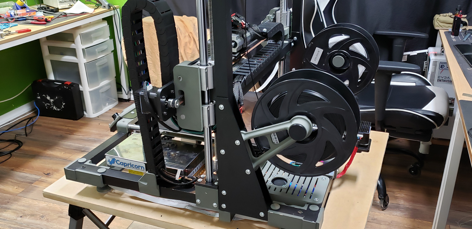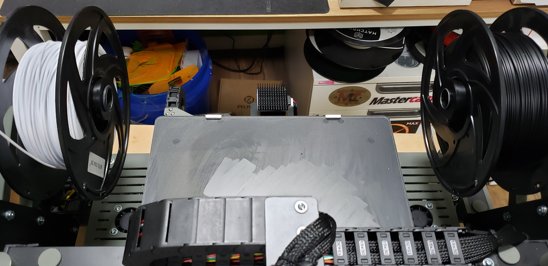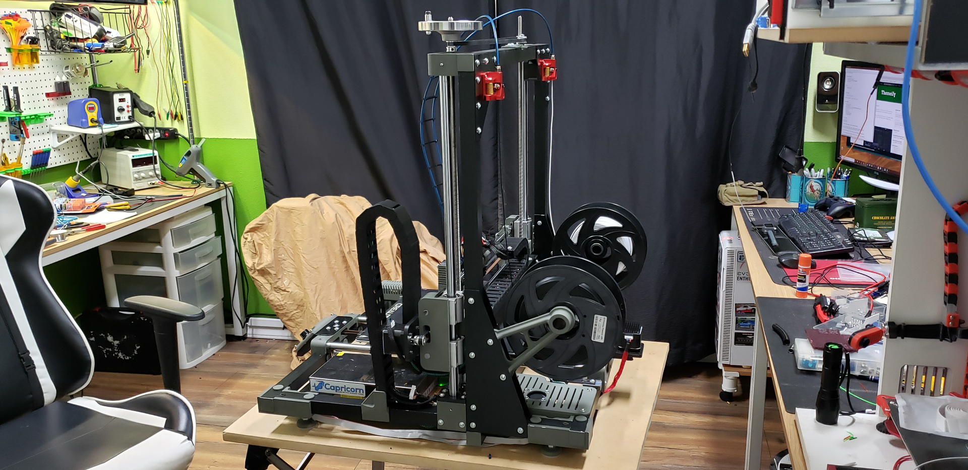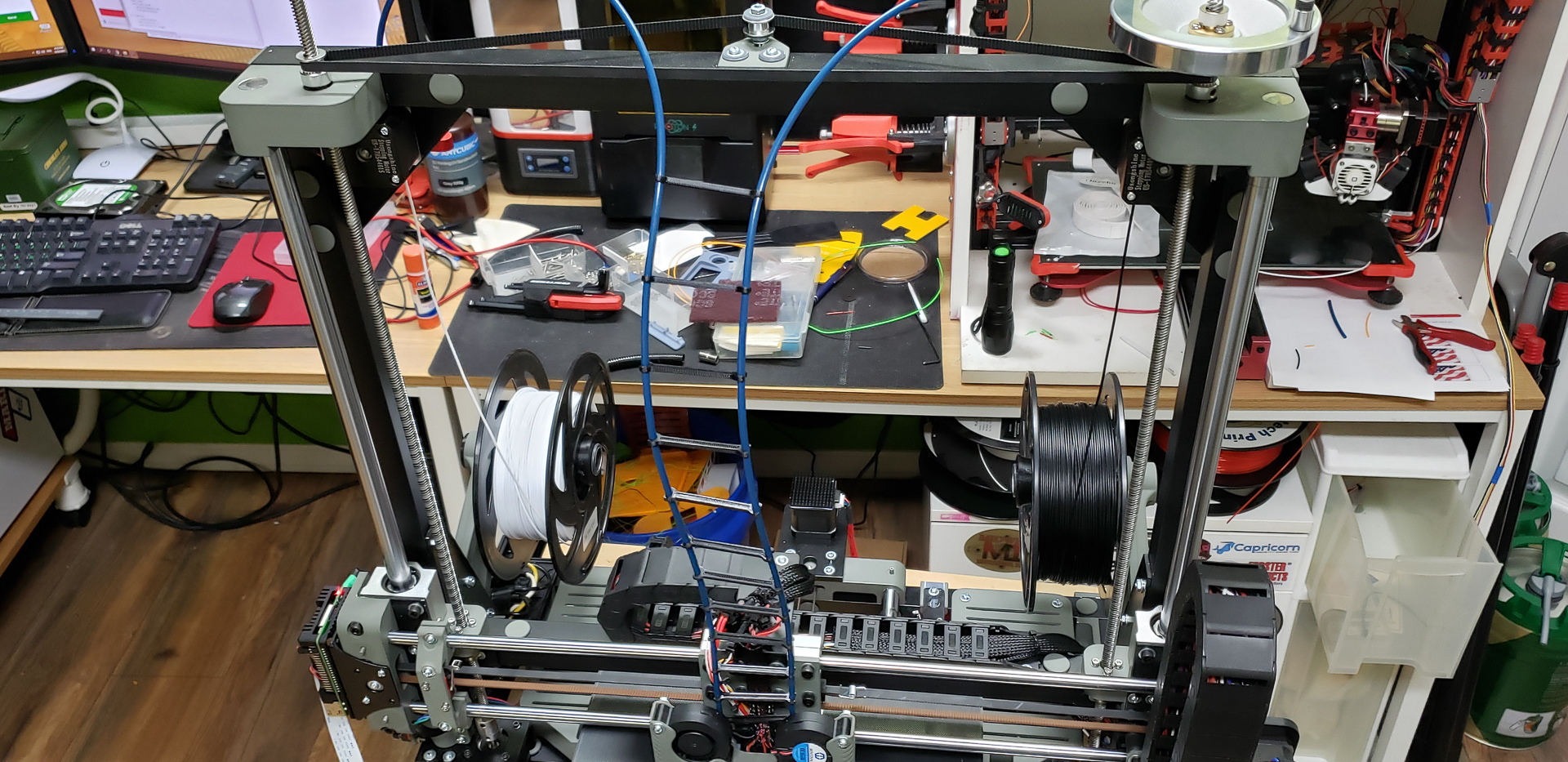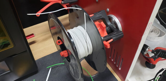 At that point, since the printer still didn’t have its own spool mounts for filament, the “feeding mother” turned out to be the frame of the old Black Widow standing next to it: