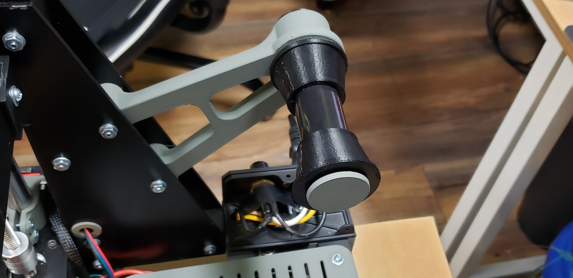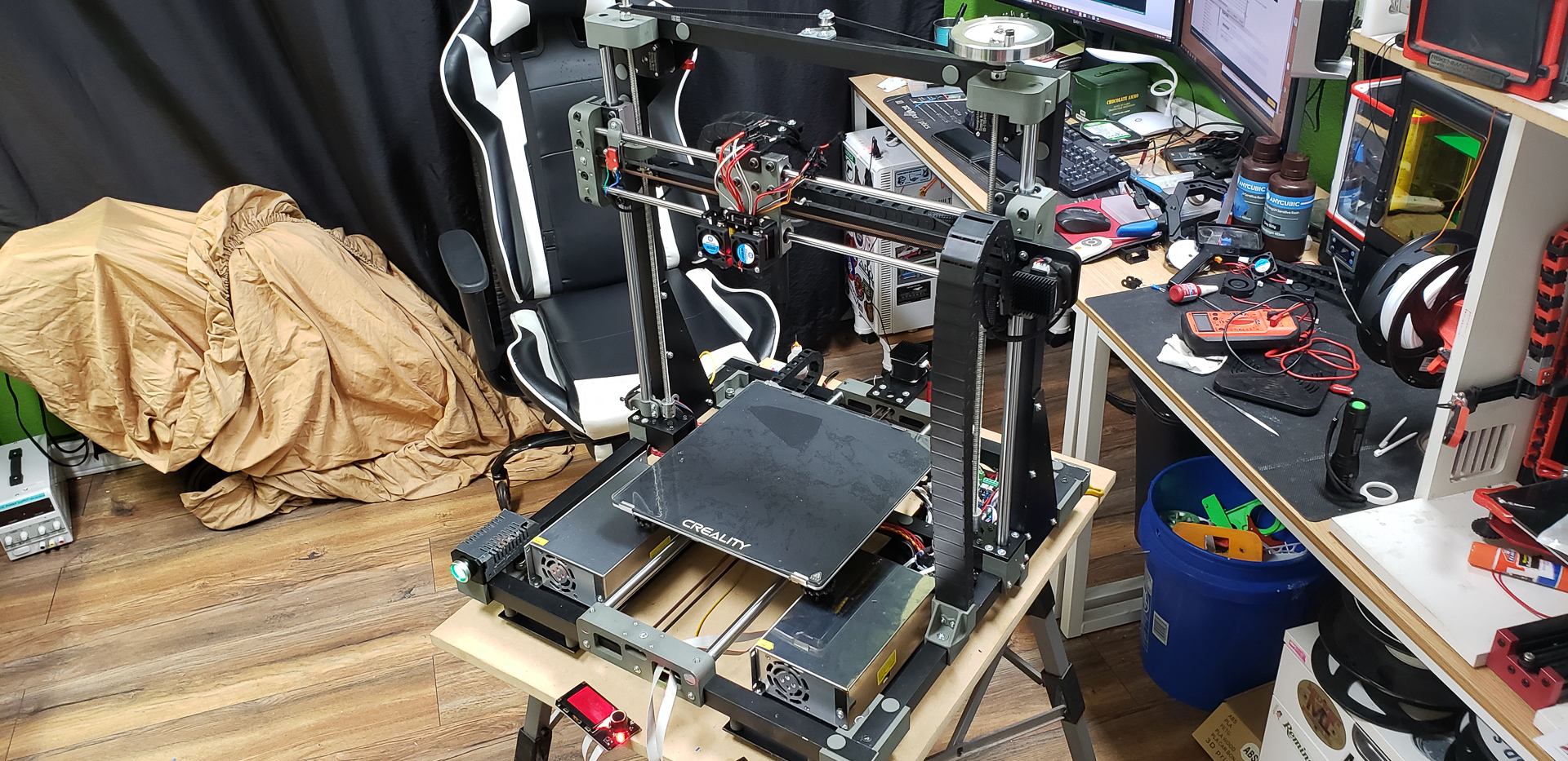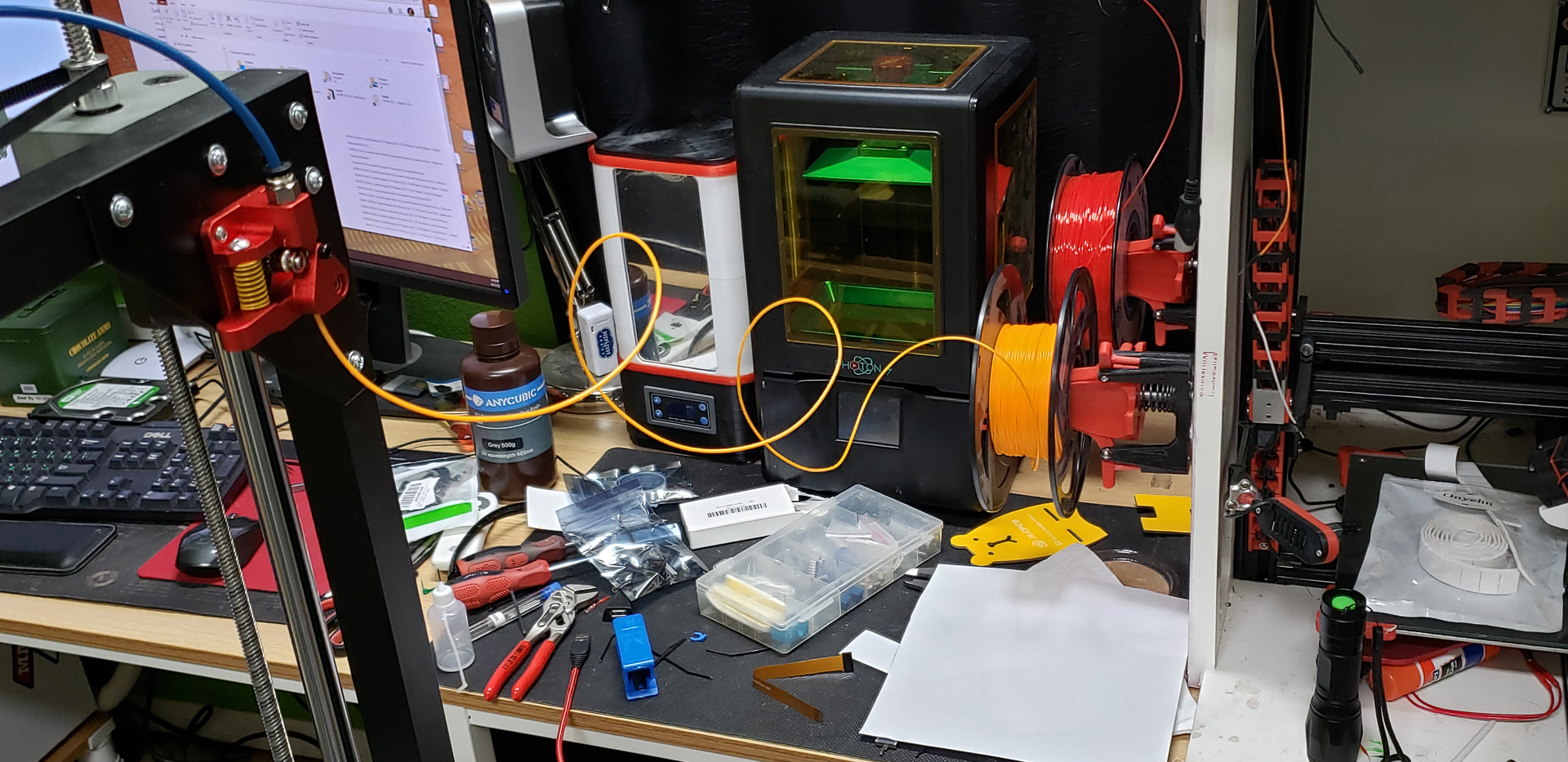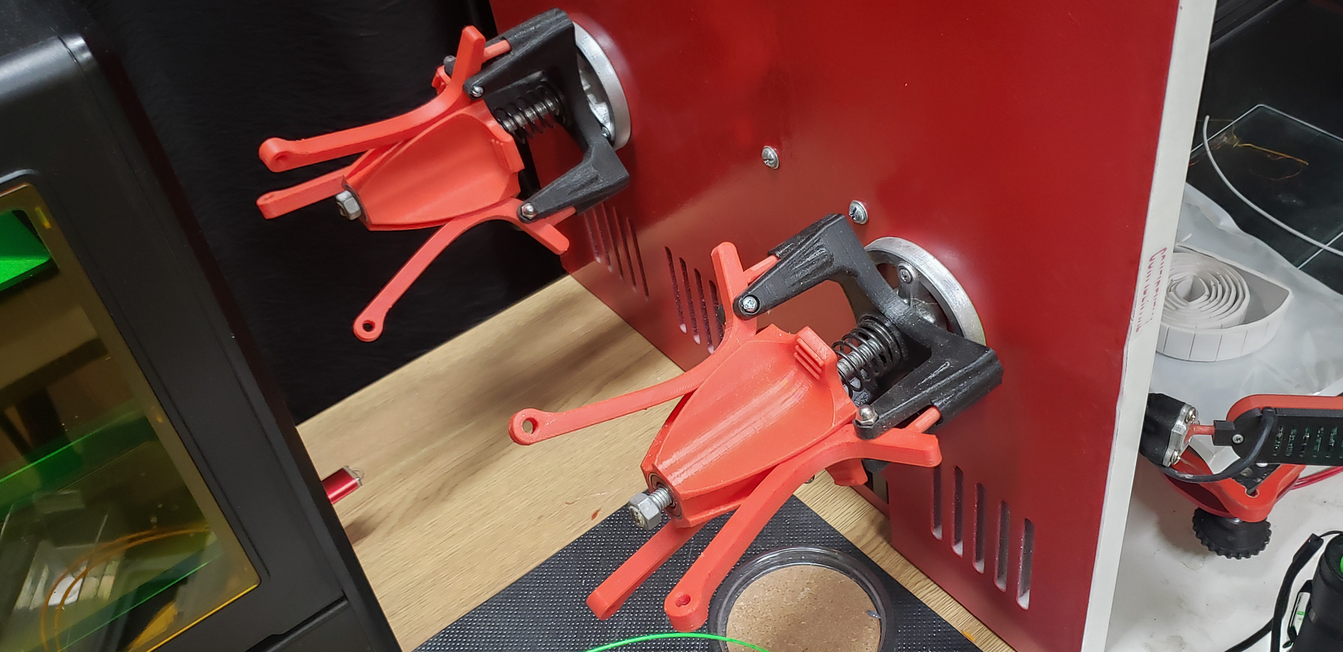 At that point, since the printer still didn’t have its own spool mounts for filament, the “feeding mother” turned out to be the frame of the old Black Widow standing next to it: