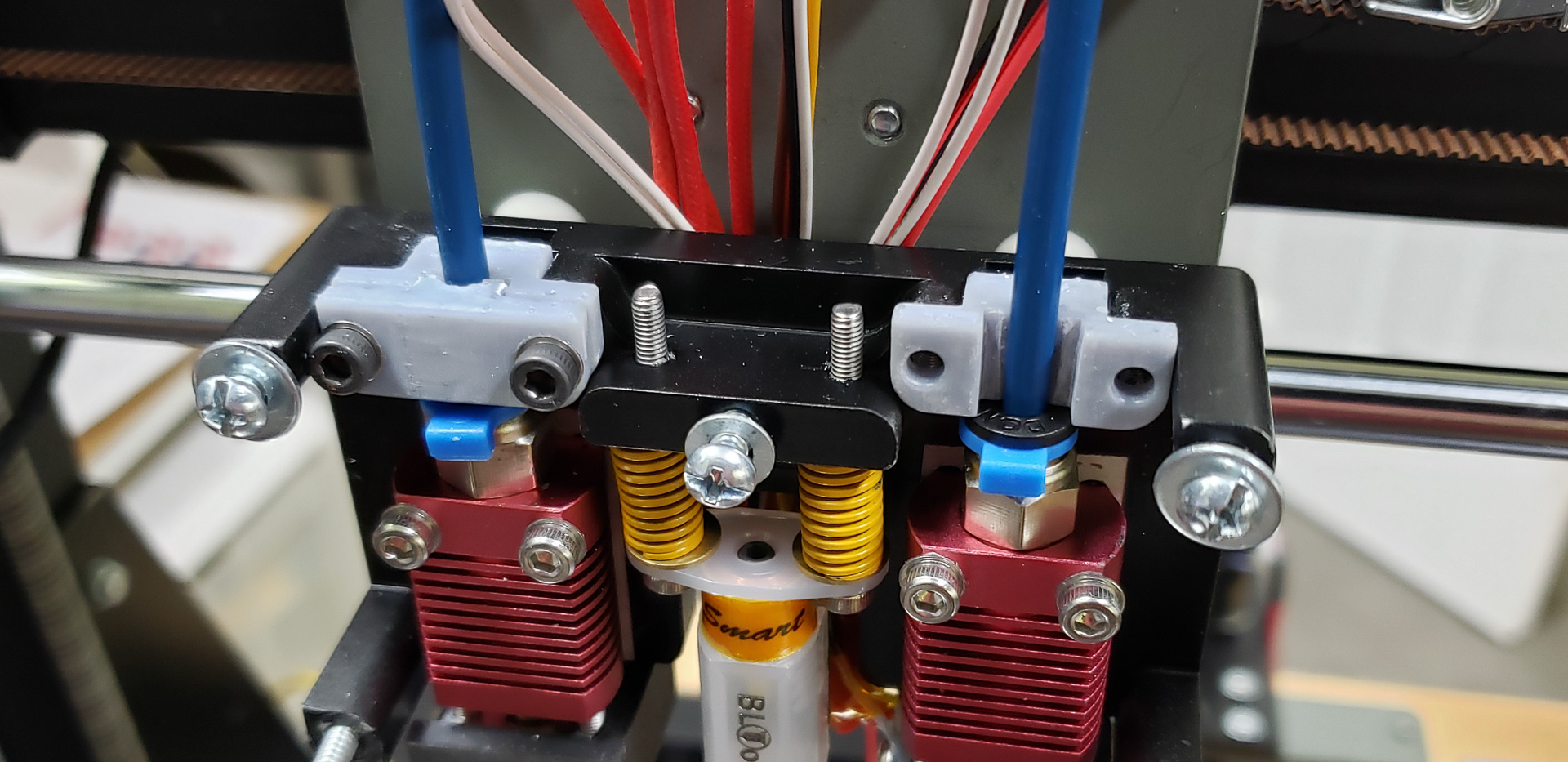 But I didn’t stop there. If you look at the photo above, you’ll notice that before the tube even reaches the fitting, it passes through another clamp (the gray one). With this additional mount, the tube has absolutely no chance to wiggle in its seating. When the screws on this secondary clamp are tightened, all possible lateral forces are removed from the fitting on the print head. This way, the fitting handles only pulling forces, while the additional mounts absorb any side-to-side stresses. Together, they hold the tube so firmly that it has no chance of going rogue.
