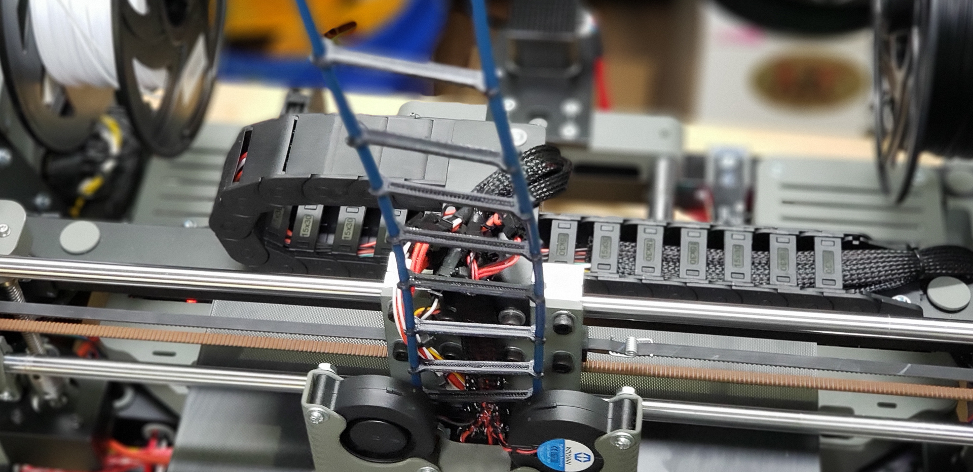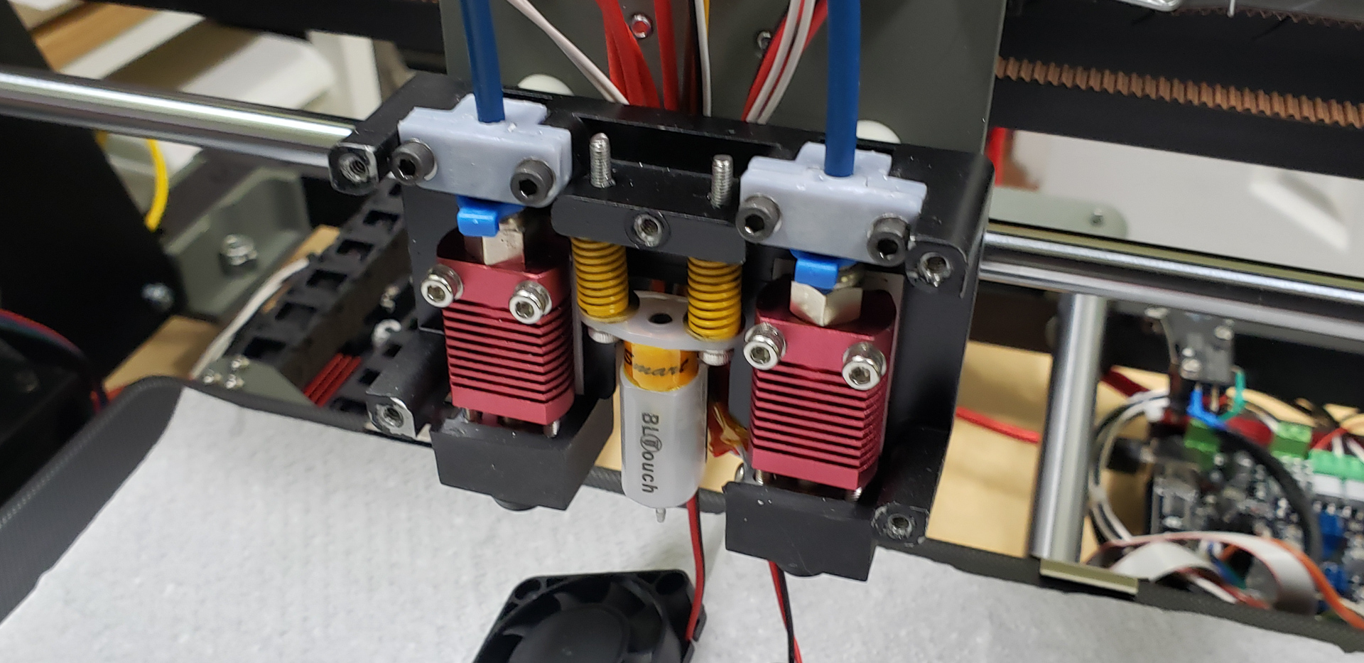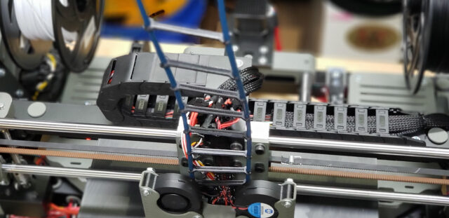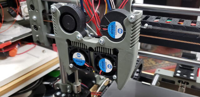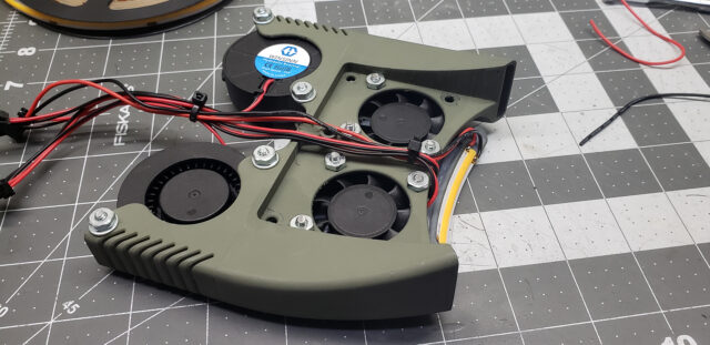 Somewhere around this stage, the puppet finally turned into a real boy. For minimal 3D printing capabilities, all it took was temporarily attaching a couple of fans — on a wing and a prayer — to cool the radiators of the print heads: