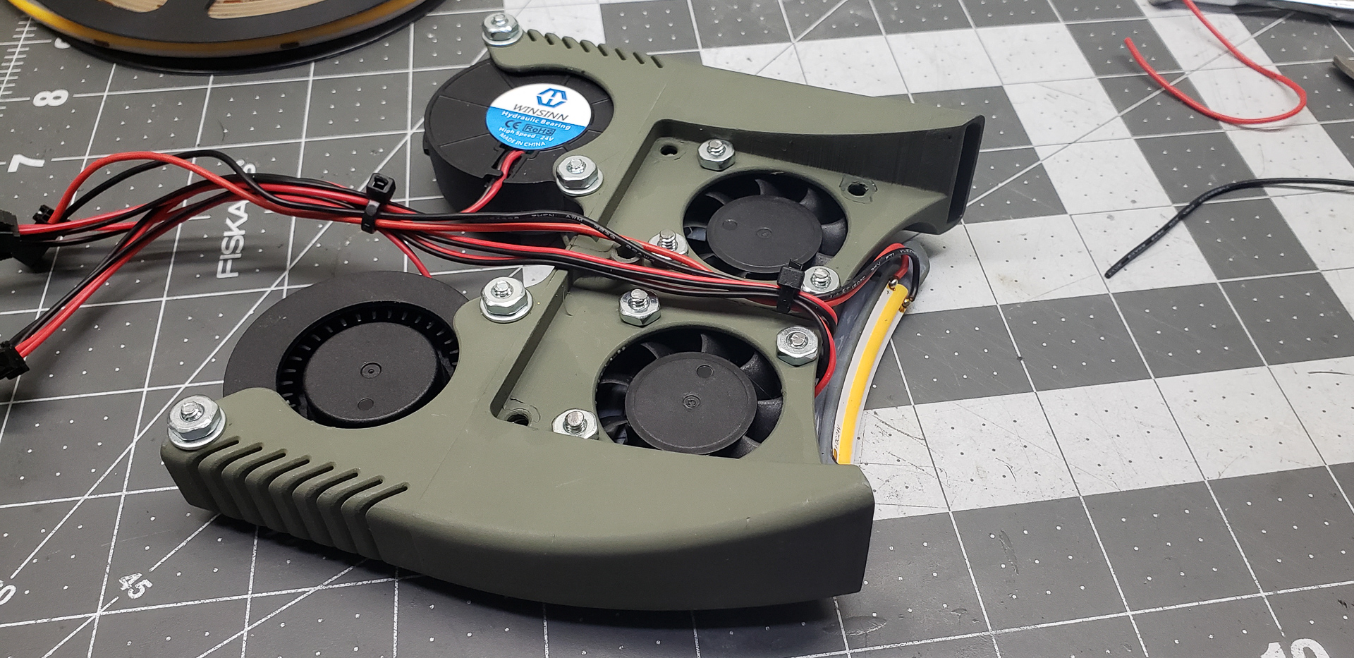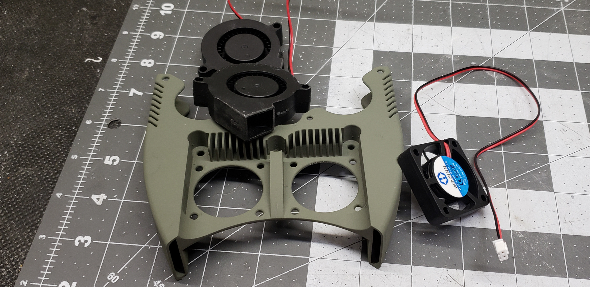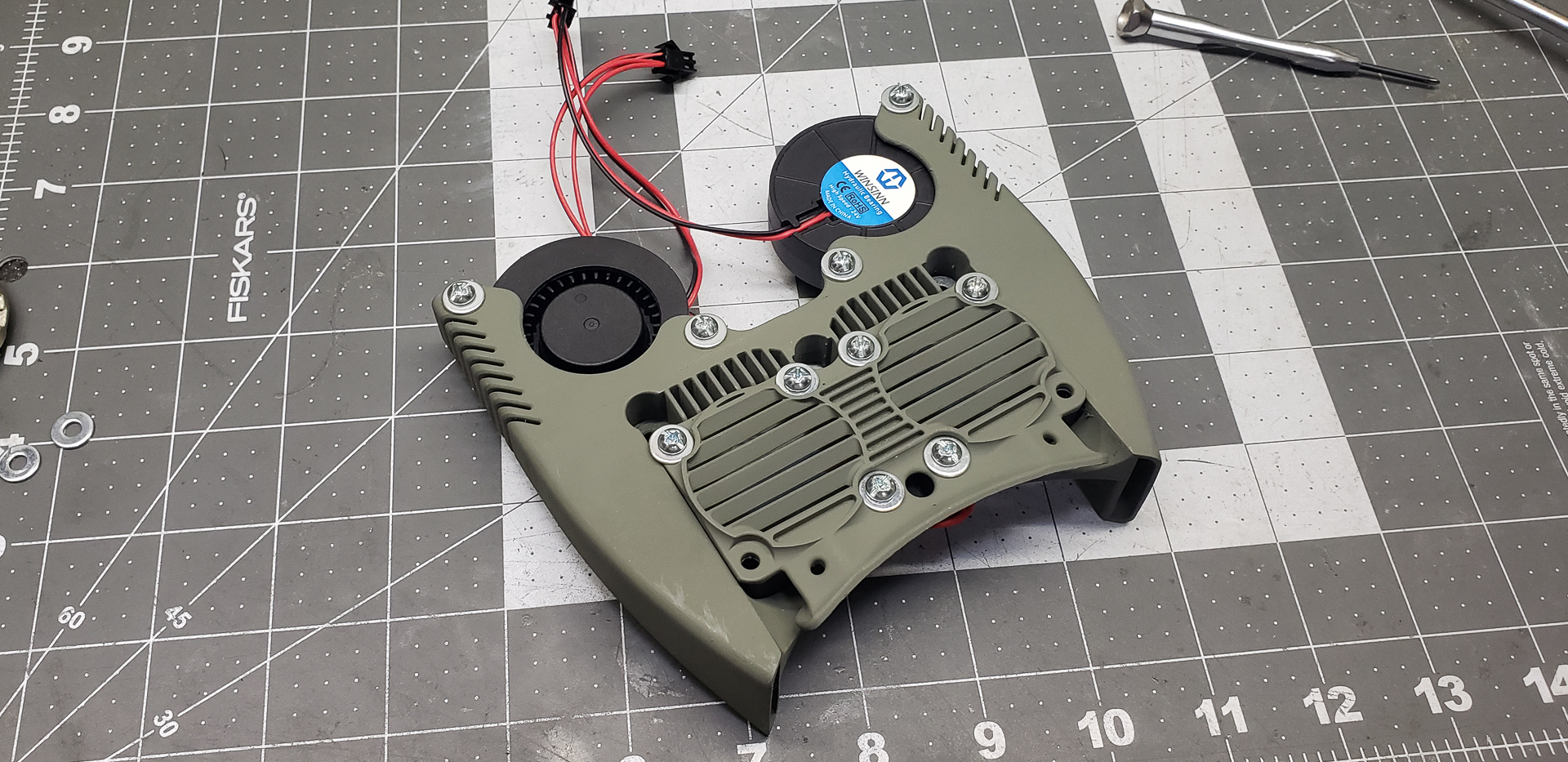 Somewhere around this stage, the puppet finally turned into a real boy. For minimal 3D printing capabilities, all it took was temporarily attaching a couple of fans — on a wing and a prayer — to cool the radiators of the print heads: