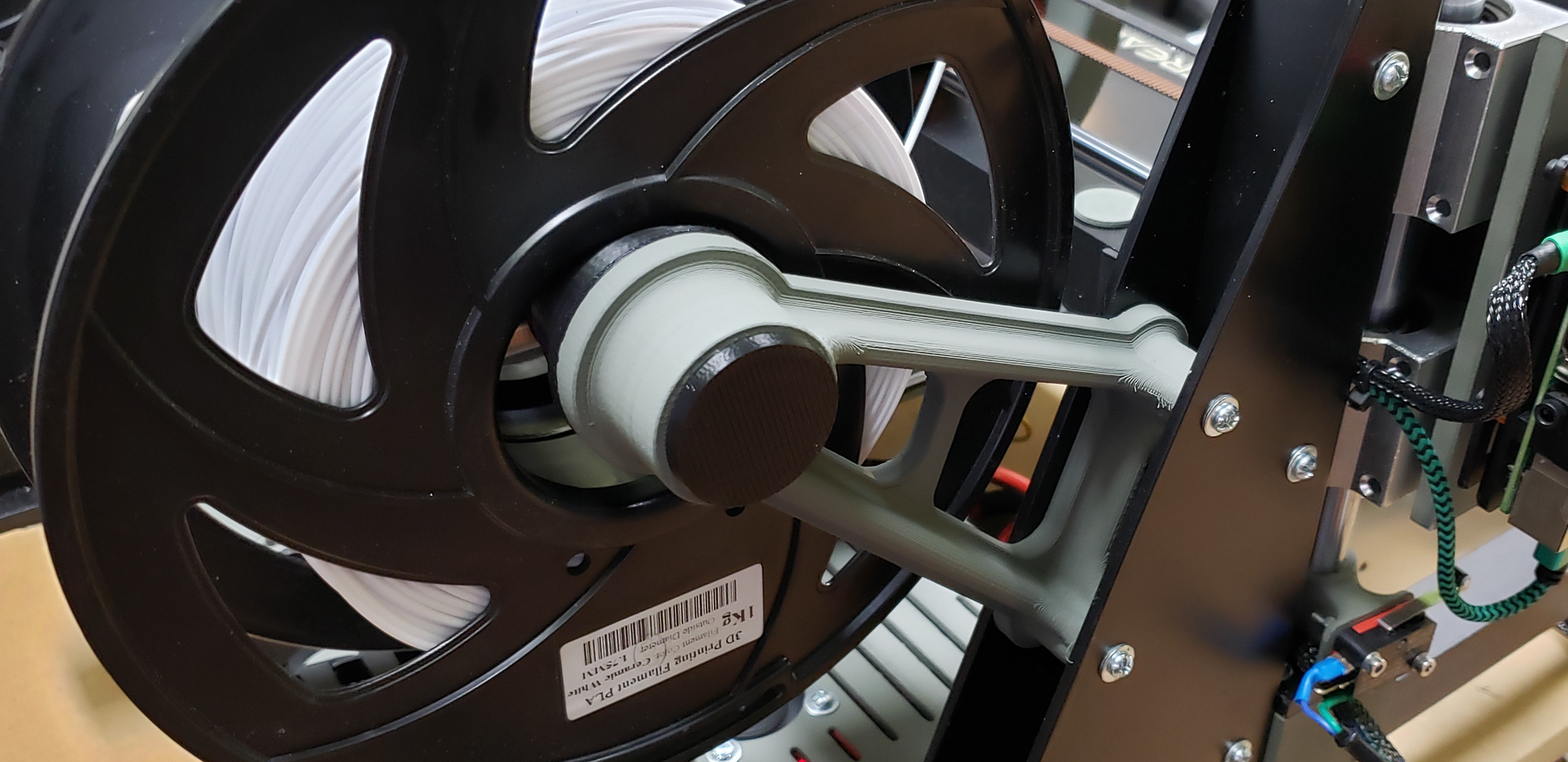 Just a simple arm attached to the printer frame, an axis, a sleeve (with no bearings), and side stops to prevent the spool from falling off: