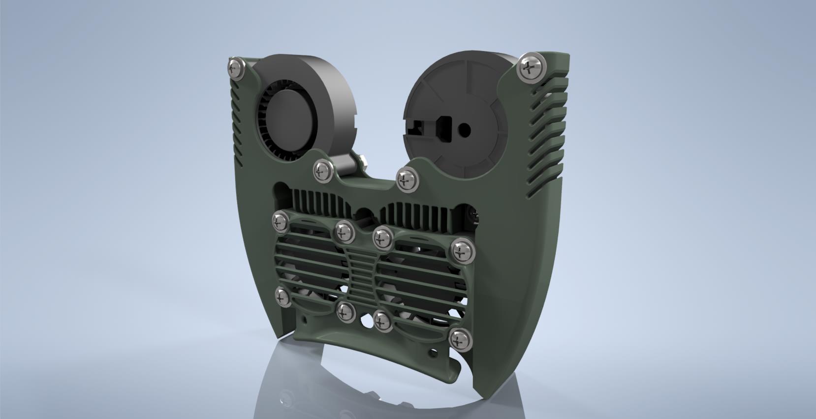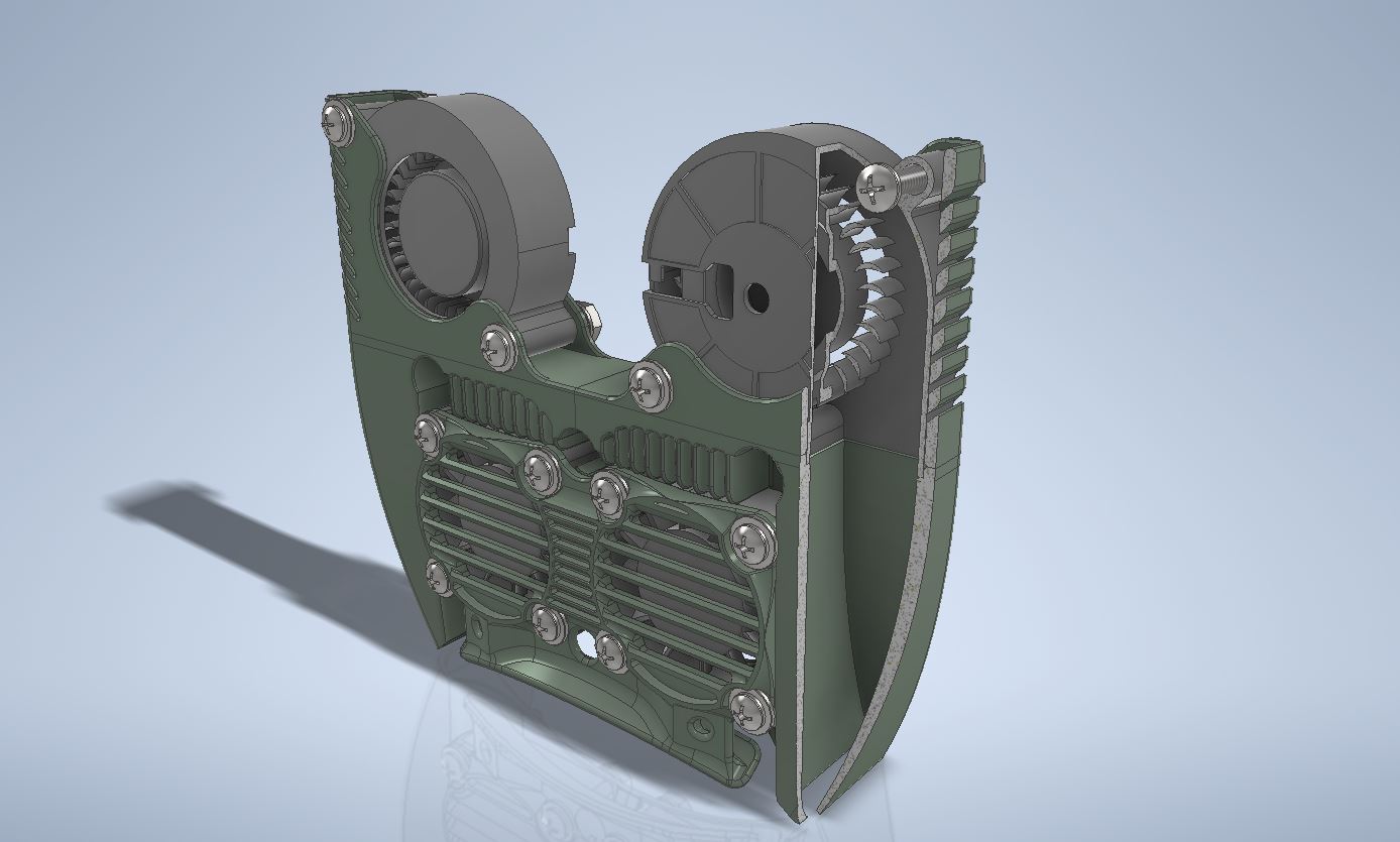 This module incorporates no less than four fans: two standard fans for cooling the print head radiators and two “blower” fans for cooling the printed layers.